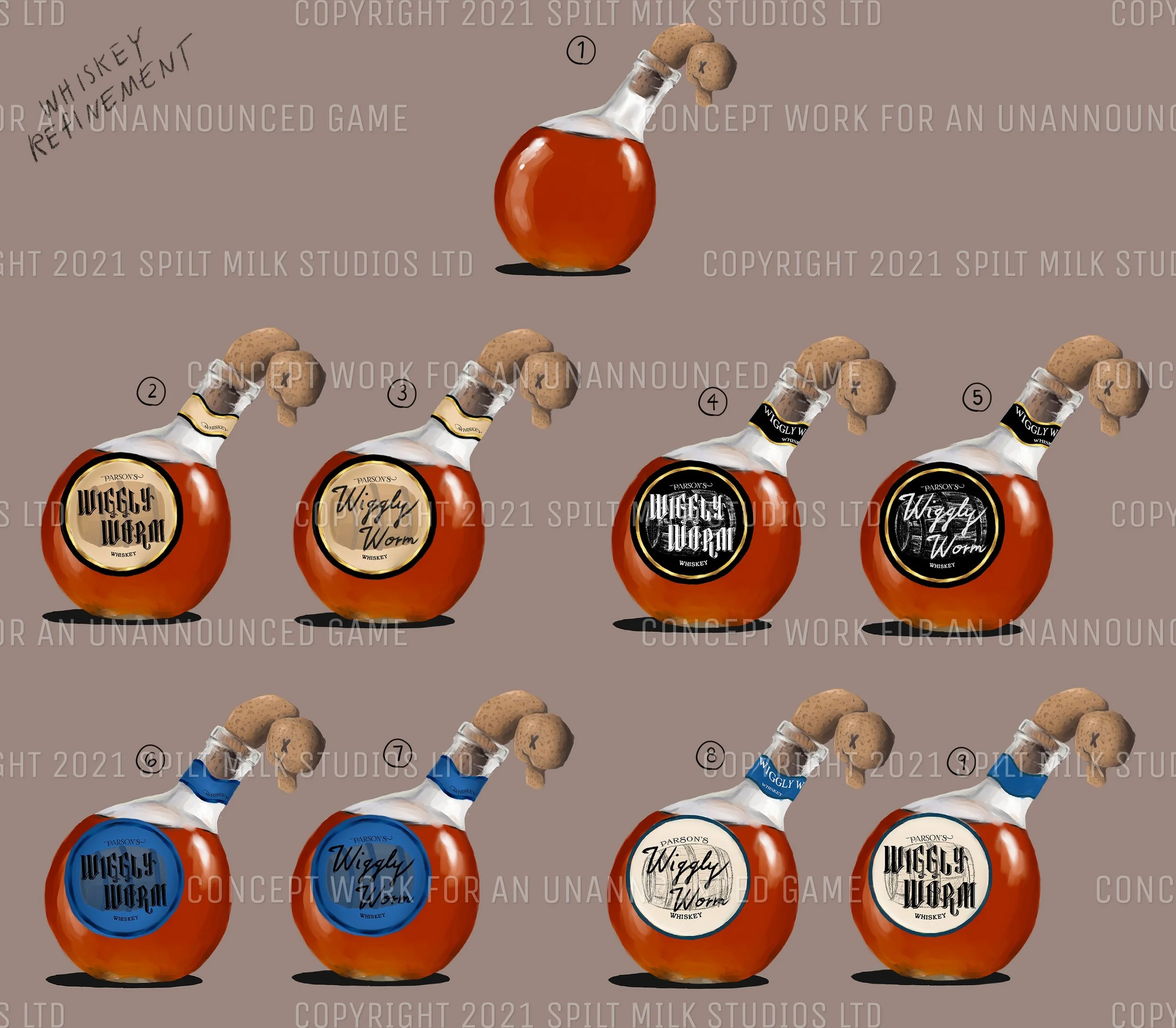 Designs I created for Spilt Milk Studios for in-game products consisting of whiskey, a coin, and a logo design.